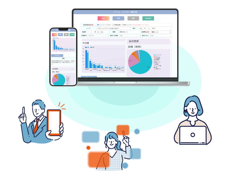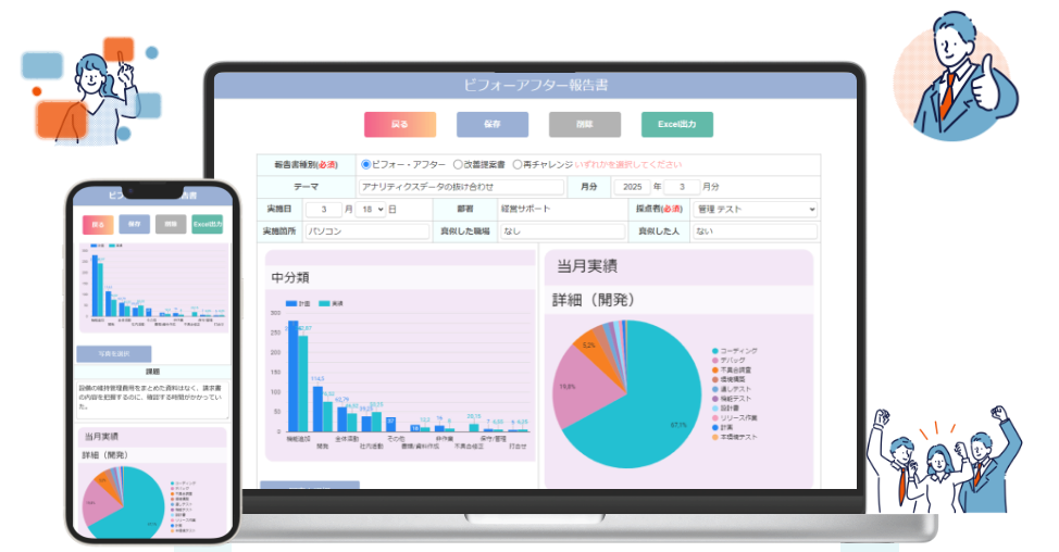 スマホやPC上でいつでも どこでも改善活動の報告書作成が可能。他部署の事例も見えるので、改善のネタ出しもWEBで楽々。