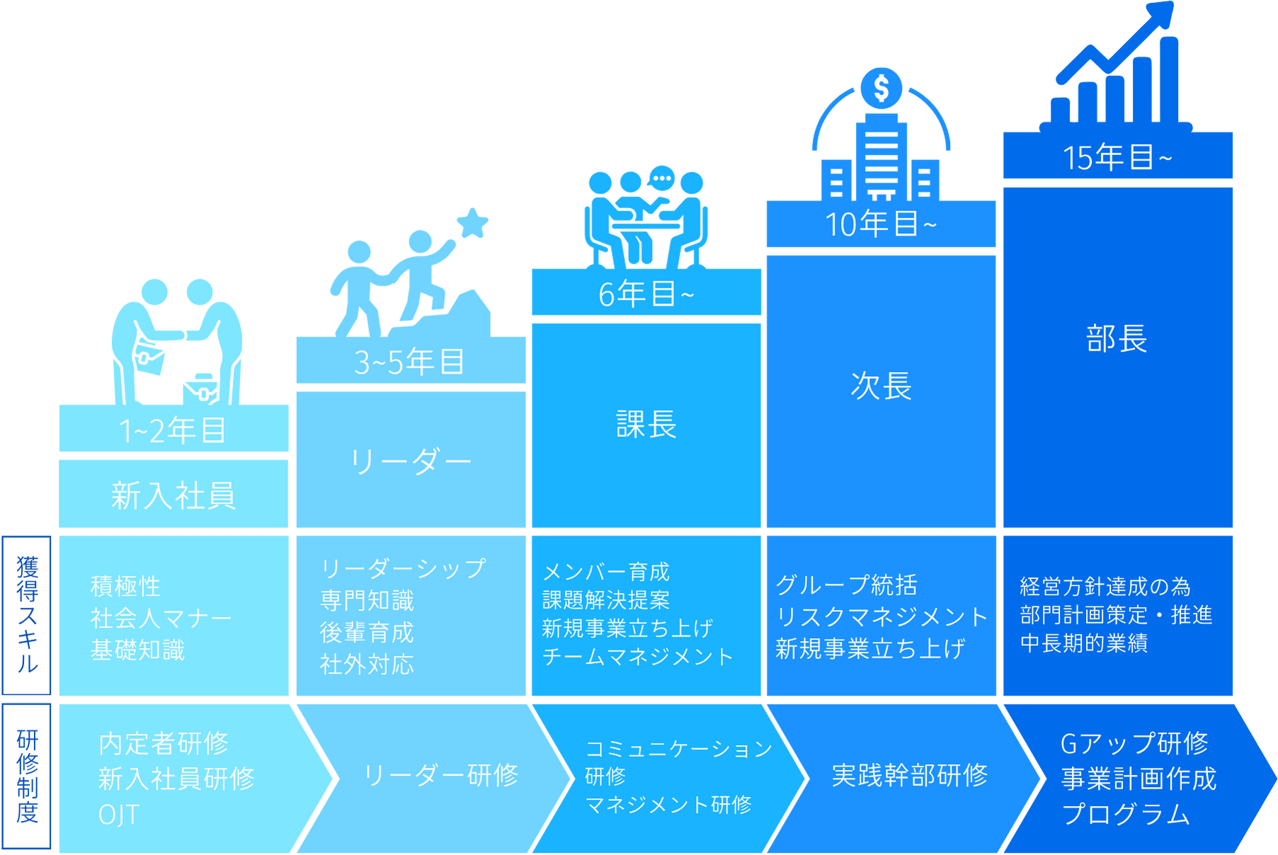 新入社員研修やOJTで基礎を身につけ、3〜5年目にはリーダーとしてチームを引っ張る存在へ。