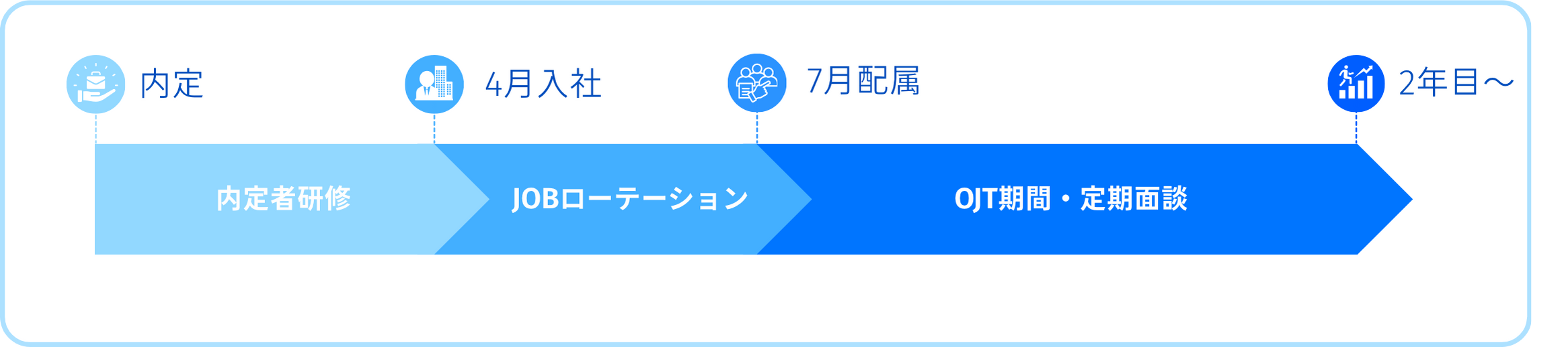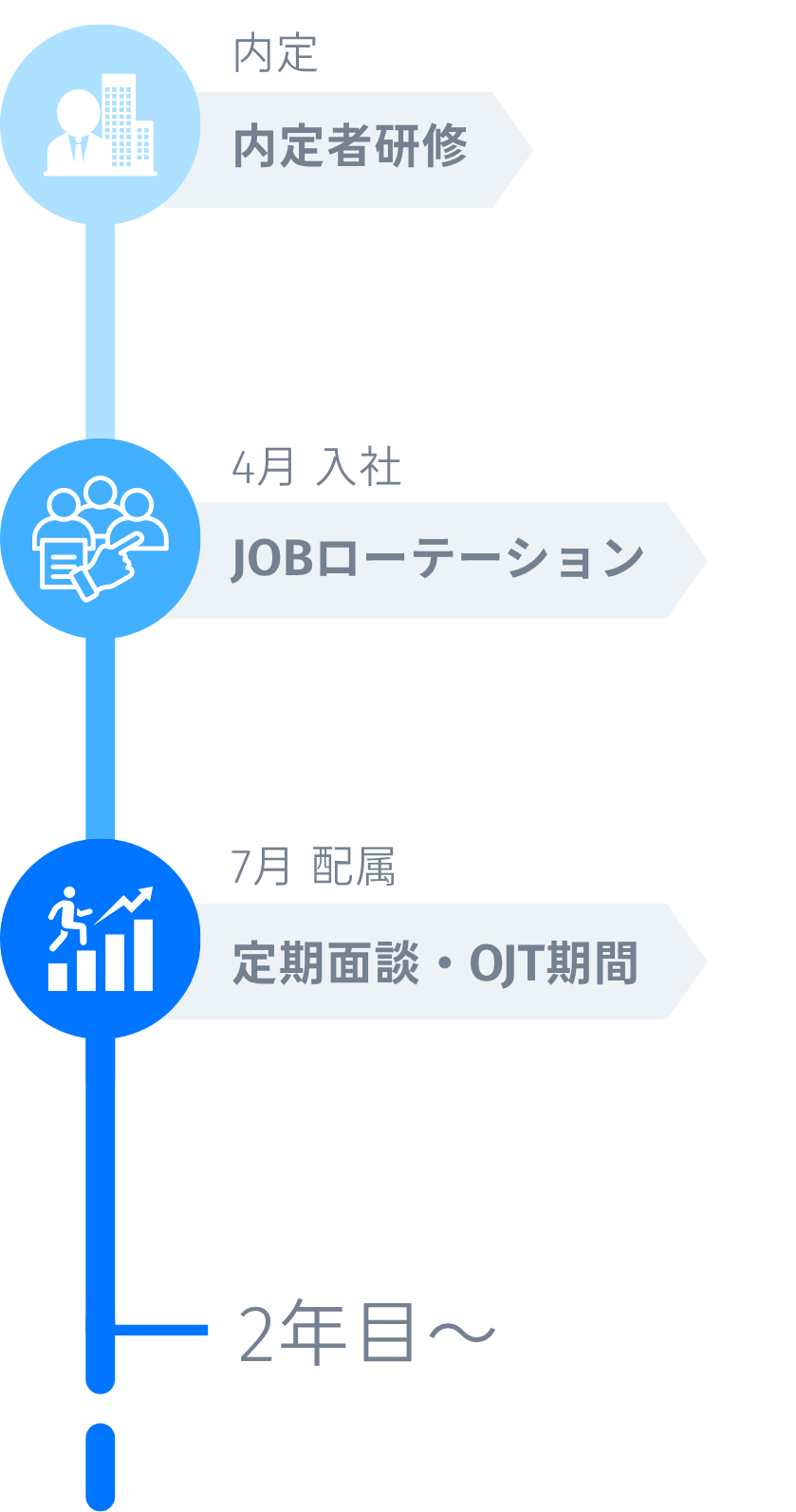 部門ごとの業務を行い事業全体を理解し、適切な配属部署を決定する手助けを行います。社員は自分の興味や適性を見極め、最適なキャリアパスを見つけることができます。